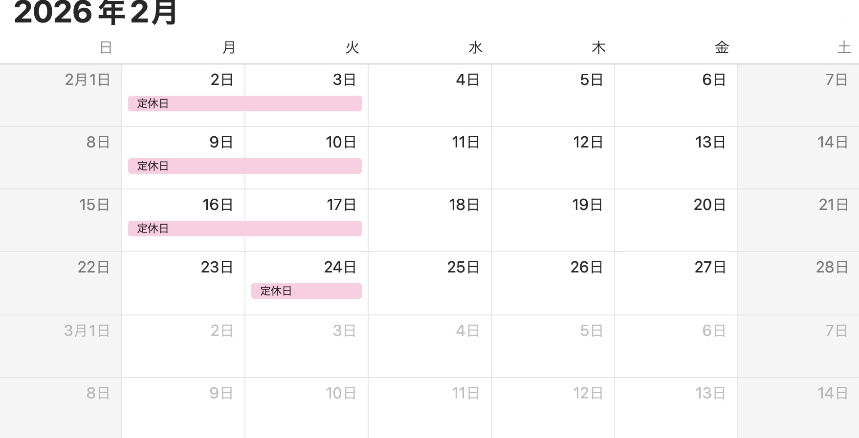 31 1月 2026 定休日のご案内 2日(mon)3日(tue) 9日(mon)10日(tue) 16日(mon)17日(tue) 24日(tue) よろしくお願いいたします 駐車場のご案内 店舗の北側 道沿いの駐車場 ⑤ と ⑥ 合計2台になります In: ブログ, 定休日 |